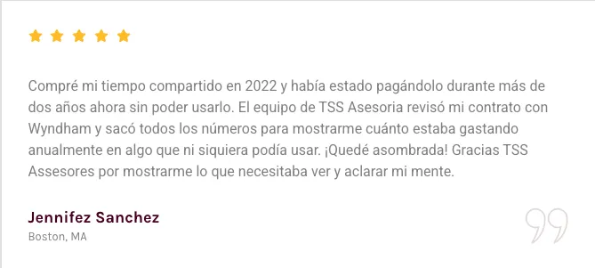 "Yo no sabía ni la mitad de lo que había firmado con el tiempo compartido. Me ayudaron a entender todo, paso a paso, y a juntar los papeles que necesitaba. Cuando vi cuántos contratos tenía, casi me da algo pero ellos me guiaron en todo el proceso. Siempre profesionales, siempre avisándome qué seguía. Después de seis meses, ya tenía todo resuelto y por fin me quité ese peso de encima. Las cuotas, el estrés ya no más. Si no fuera por ellos, honestamente, no sé cómo habría salido de eso. Mil gracias."